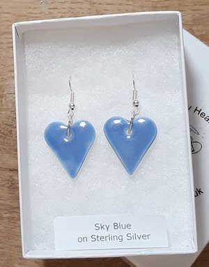 Sky Blue Earrings The softest of blues - like the sky on a sunny day. These gentle blue heart earrings are such a lush colour to wear. Size: 20mm x 20mm approx. Sterling silver findings. £12.50 per pair
